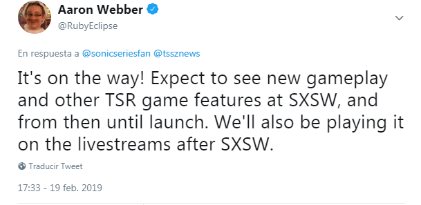 En un hilo en el Twitter de TSSZ, Aaron Webber (encargado del Social Medial de SEGA) confirmo que habrá un nueva información y novedades de Team Sonic Racing en las próximas semanas, así como también un nuevo gameplay y algunas novedades en la SXSW.